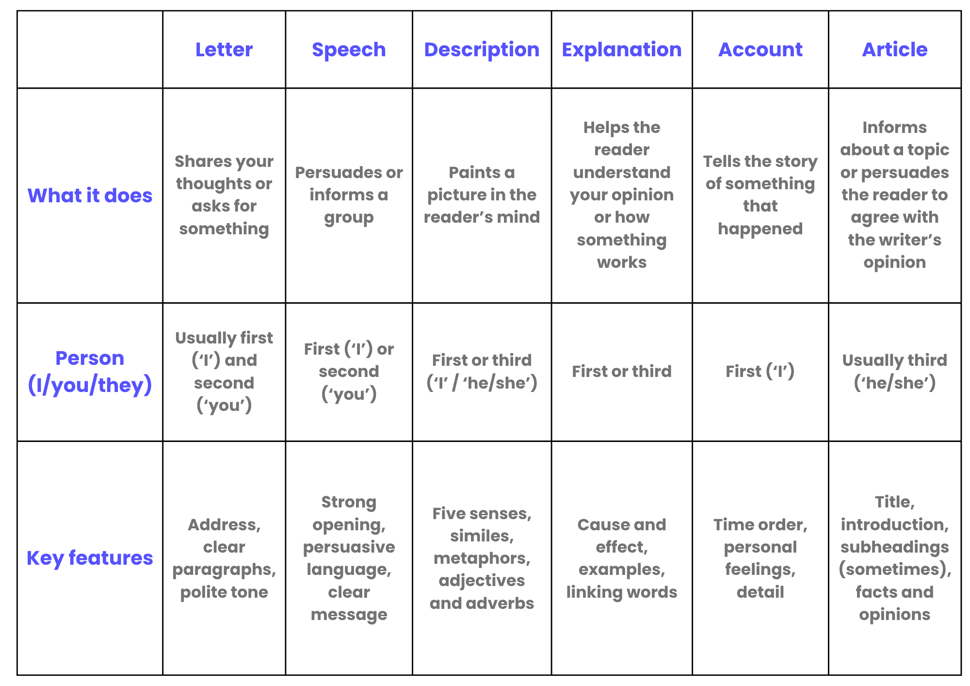 When children are asked to write non-fiction texts, this usually involves explaining their opinions and describing their personal experiences. A few schools require children to write for other purposes, such as persuading, informing, discussing or instructing. Writing tasks might not specify the type of text, or they might ask children to write a specific text type like a letter, article, leaflet or speech. The most important thing is responding to the task clearly and effectively.
