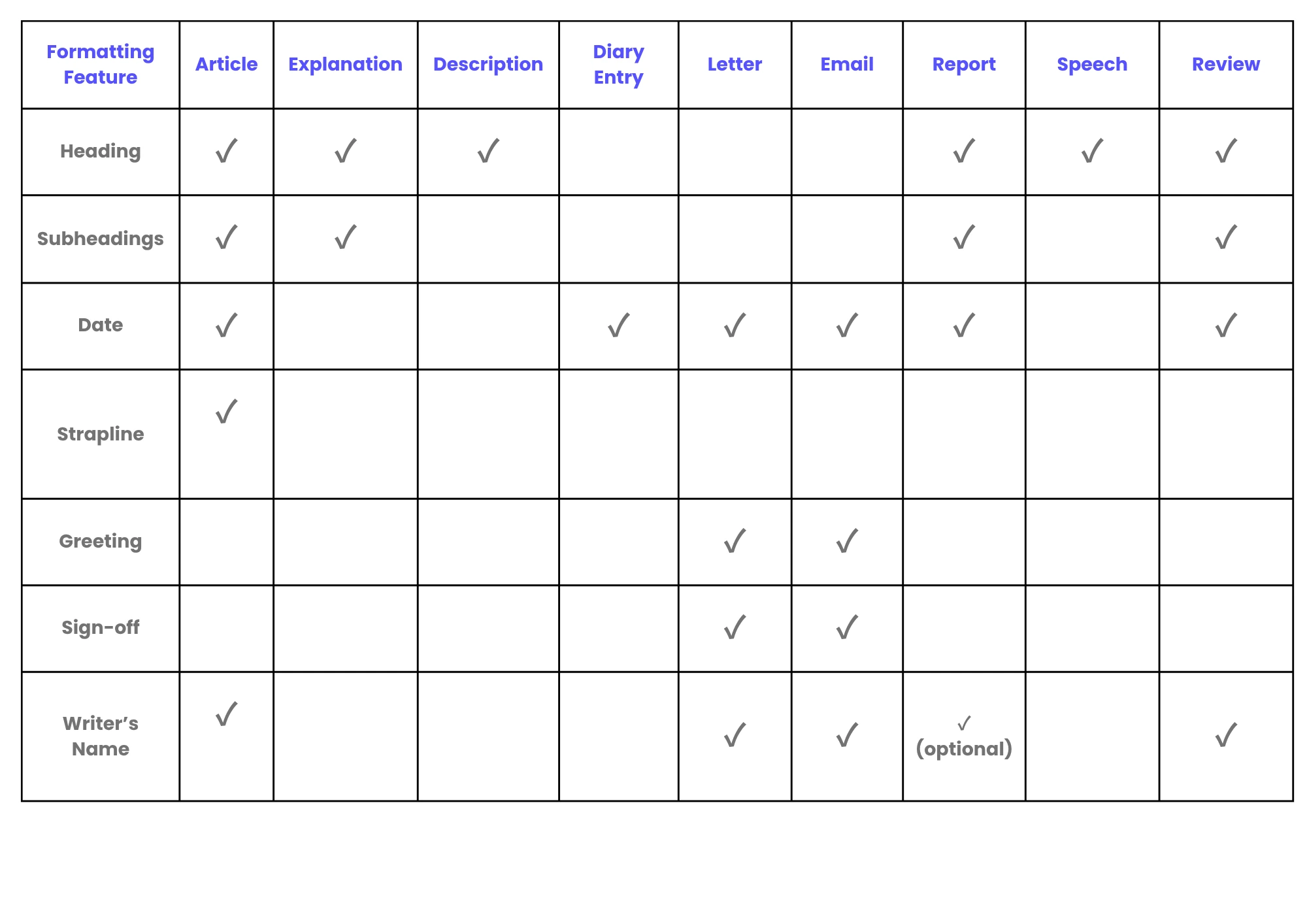 Formatting isn’t the most important part of the 11+ writing task. Content, clarity, and structure matter more. However, it’s still helpful to show that you understand the basics of how different texts are set out.