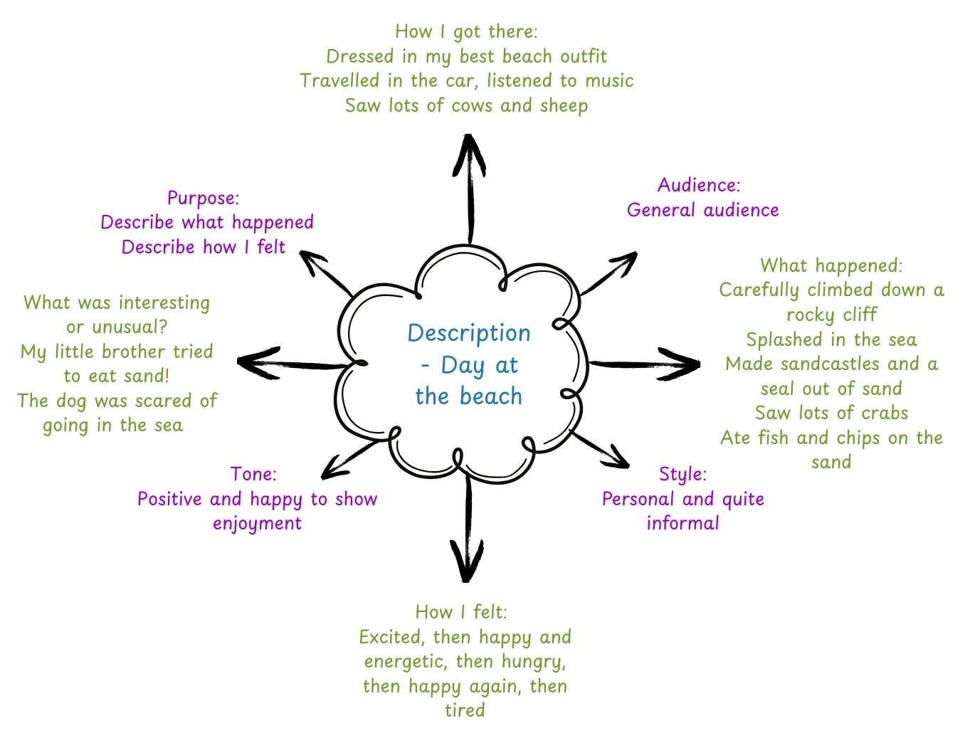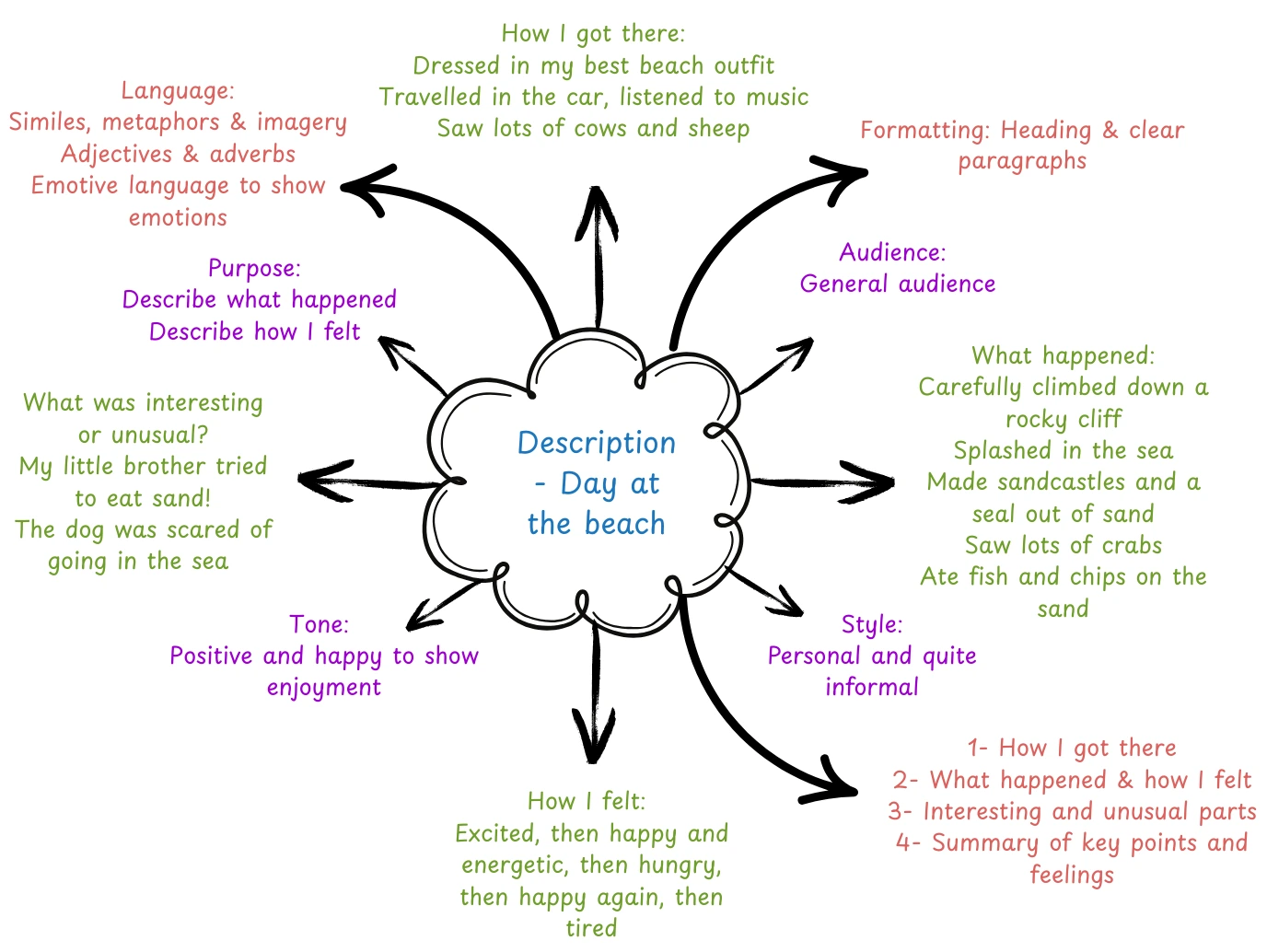 - Paragraph 2 – What I did – Climbing on rocks, building a sandcastle, playing in the sea. How I felt (fun, excitement, energy)