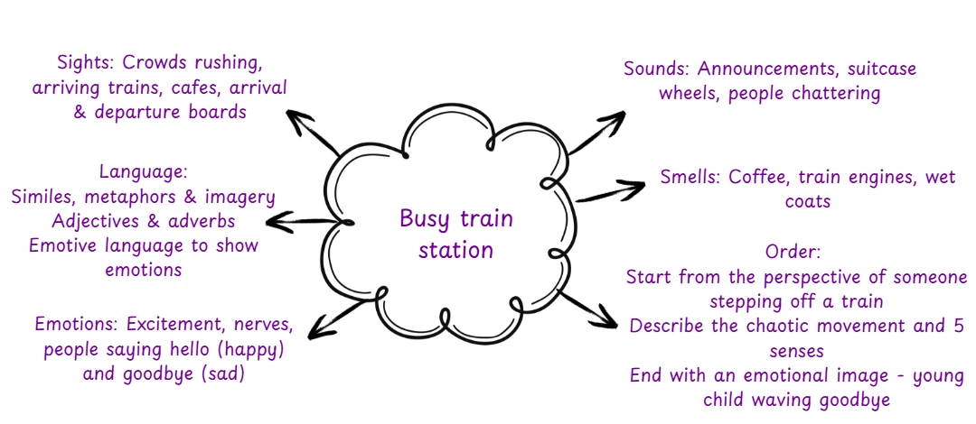You don’t need to write long answers. Just jot down some short notes to remind yourself of key moments or details. You won’t have time to cover all of the points in detail, so just use the mind map to start getting some simple ideas before you write.