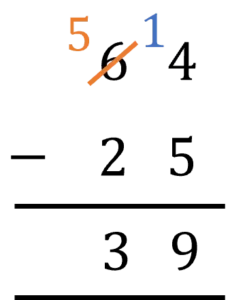 Then move left onto the tens column. The top number is less than the bottom number so we will need to “borrow” a \textcolor{blue}{1} from the number in the hundreds column. In this case, the 5 in the hundreds column becomes a \textcolor{orange}{4} and the \textcolor{blue}{1} is given to the tens column to make \textcolor{blue}{1}2.
