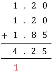 The important thing for your child to remember when adding decimals is to correctly line up the decimal points. In this example there are a different number of decimal places after the decimal points, so it’s easy to get confused!