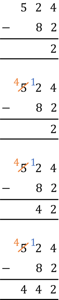 For the hundreds column we now have a \textcolor{orange}{4} instead of a 5. There isn’t a number in the hundreds column for the bottom number, so the calculation becomes: