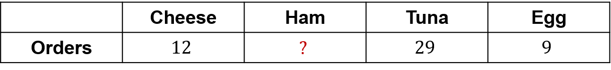 Adding up the orders for cheese, ham and tuna, we have 12+29+9=50.