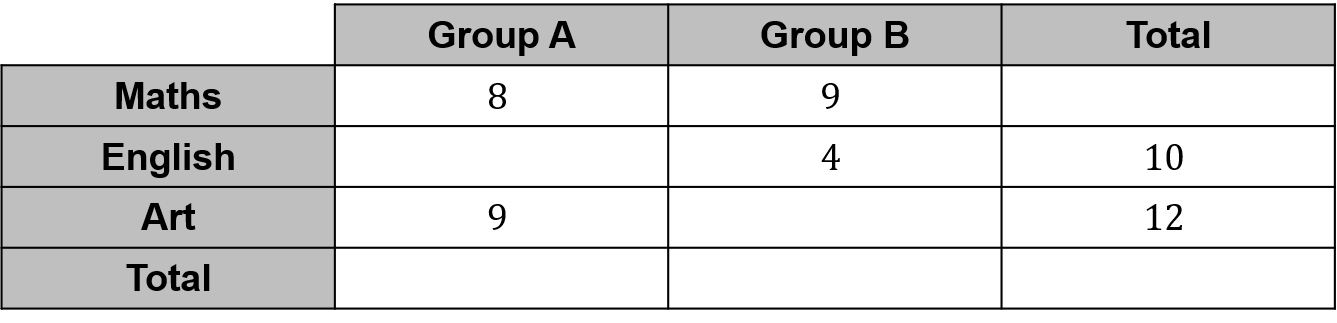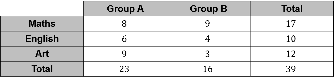 Question 3: A class of children were split into group A and group B. They were all asked to choose their favourite subject. The information is shown in the table.