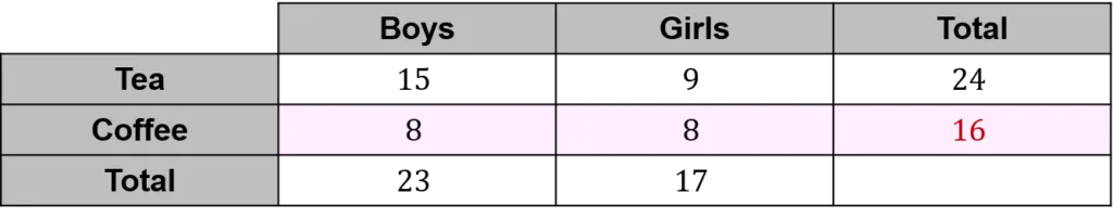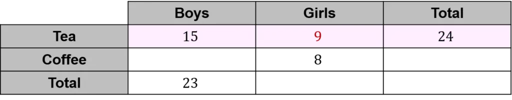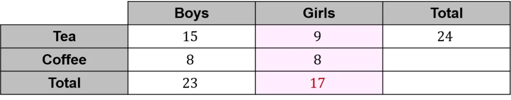 Let’s start by looking at the row for tea. We know the total must be 24, so the missing value for girls must be 24-15=9