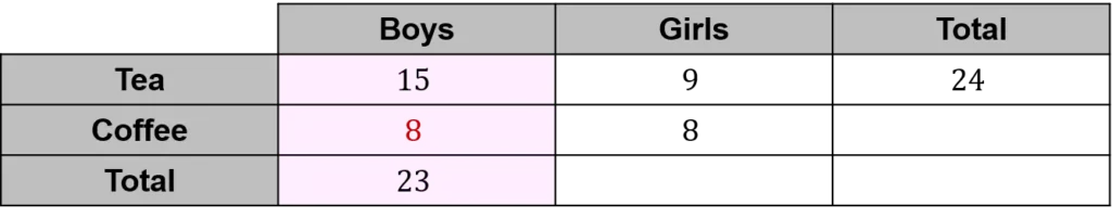Now let’s look at the column for boys. The column needs to add up to 23, so the missing value for coffee must be 23-15=8