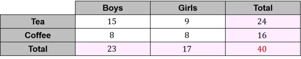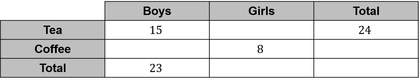 Example: A group of children were asked whether they preferred tea or coffee. The results are shown in the table below. Complete the table.