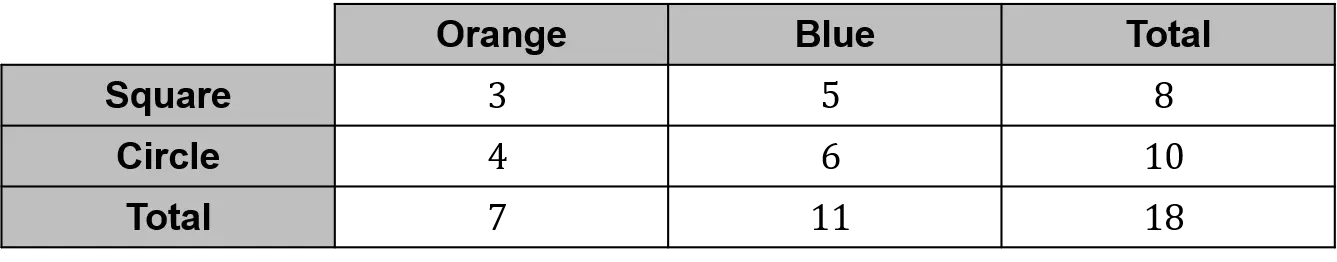Example: A bag contains wooden shapes. The shapes are either squares or circles, and they are painted either orange or blue. This information is shown in the two-way table below.