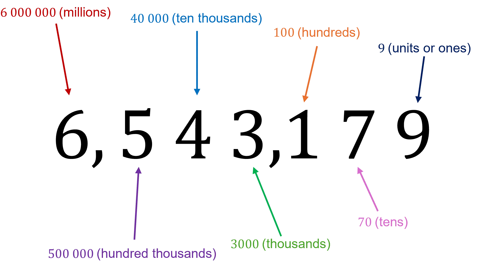The example above shows what each digit is worth in the number 6, 543, 179. This number can be spoken in words as: