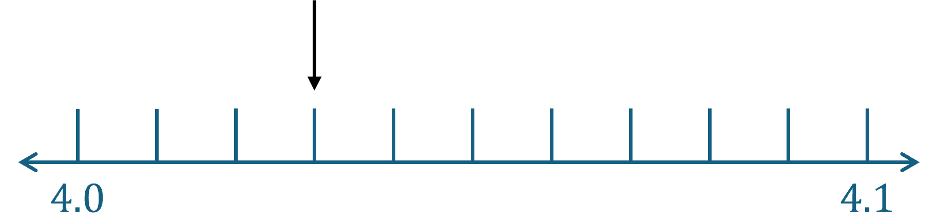 Let’s start by looking at the two numbers at the ends of the number line. It starts at 4.0 and ends at 4.1, so we know the arrow must be pointing to a number between those two.