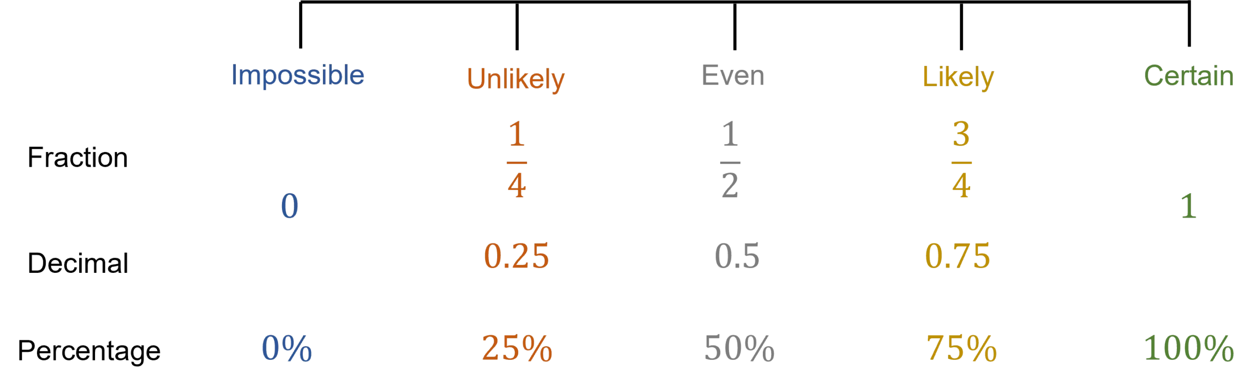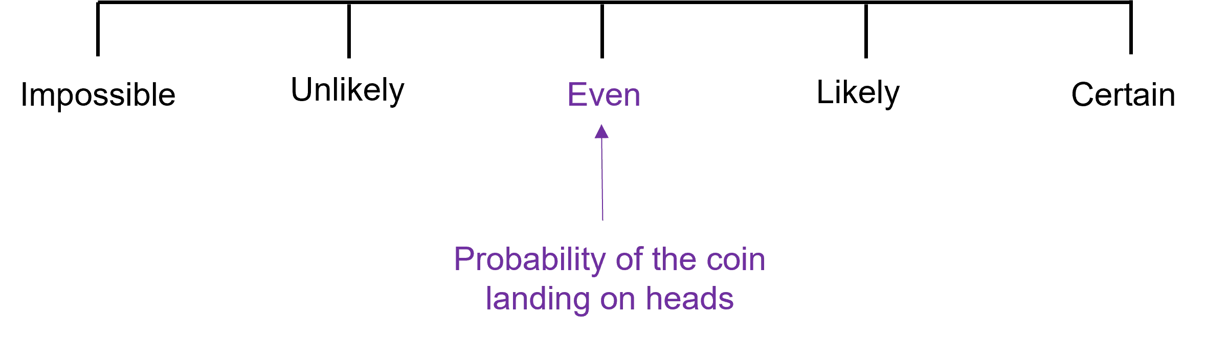 The range of probability is from impossible to certain and can be visualised on the probability scale below.
