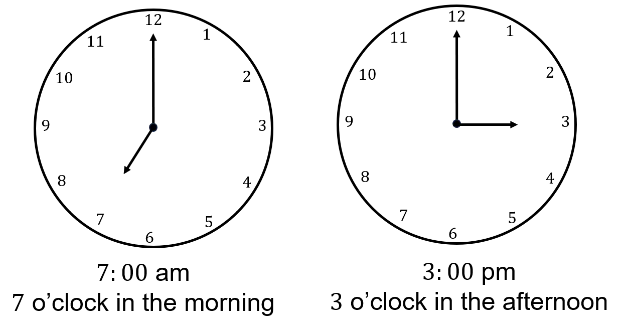 The hours on a \bf{12}-hour clock are shown by the numbers 1-12. We need to add \textbf{am} or \textbf{pm} to show whether the time is in the morning or the afternoon.
