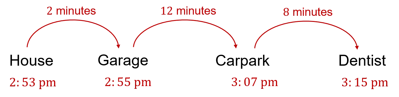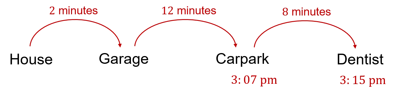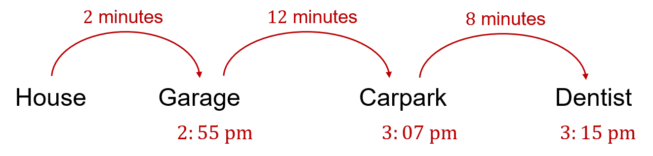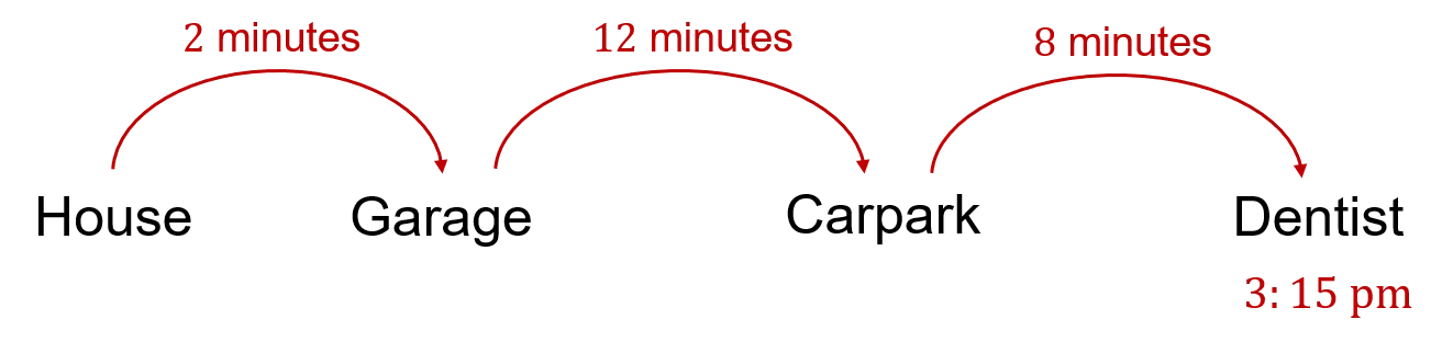 Example: Harry needs to be at the dentist in town by 3:15\text{ pm}. It takes him 2 minutes to walk from his house to the garage where he stores his car. It then takes him 12 minutes to drive to the carpark in town. Finally, it takes him 8 minutes to walk from the carpark to the dentist. What is the latest he can leave his house?