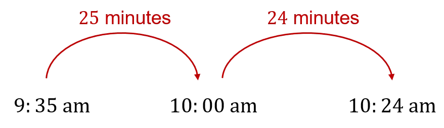 It would take 25 minutes to 10:00\text{ am}, and then another 24 minutes to 10:24\text{ am}.