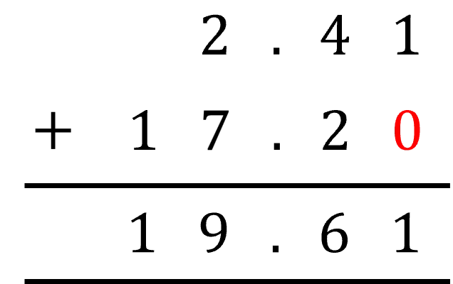In this example 17.2 only has 1 number after the decimal point but 2.41 has 2 numbers after the decimal point. To ensure everything is lined up correctly a \textcolor{red}{0} can be added to make 17.2\textcolor{red}{0} which doesn’t change the value of the number but makes it easier to line up.